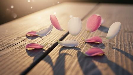 Pink and white flower petals are scattered and floating above a rustic wooden plank, illuminated by soft light with...