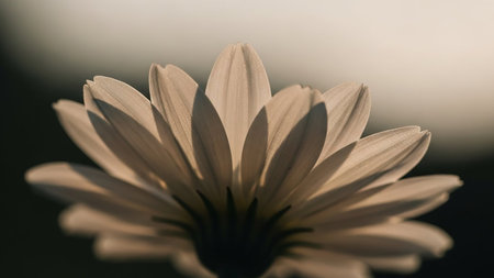 A close-up of a white daisy with backlit petals, bathed in warm golden sunlight, creating a soft and tranquil visual effect.