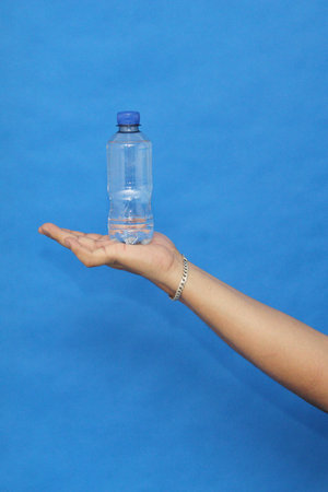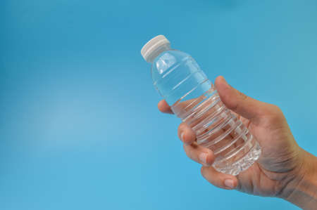 Hand holding mineral water isolated on a blue background. Copy space for the text