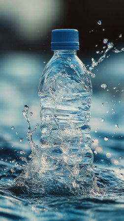 A blue capped plastic bottle stands upright in water, surrounded by splashes as sunlight creates a magical glow. The moment captures natures refreshing essence and environmental connection.