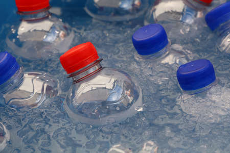 PET plastic bottles of cold still and sparking drinking mineral water with blue and red caps float and chill down in ice and water on retail market display, close up, high angle view