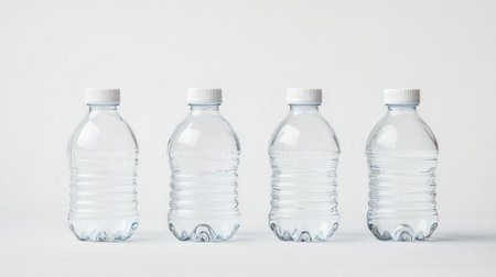 A close-up view of four identical transparent plastic water bottles, each filled with clear liquid and sealed with a white screw cap, arranged neatly in a line.
