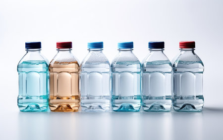 Several drinking water bottles on white background. Eco concept. Copy space for your text.