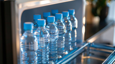 Row of plastic water bottles cooling in refrigerator