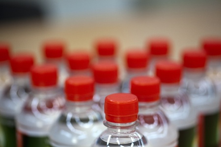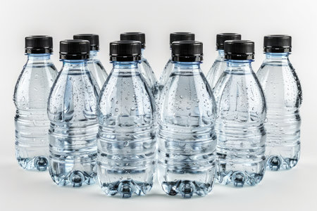 Group of plastic bottles with water.