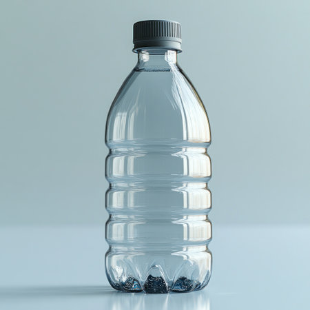 A plastic water bottle lying on its side on a smooth reflective surface, light highlighting the contours and cap details, minimalistic composition