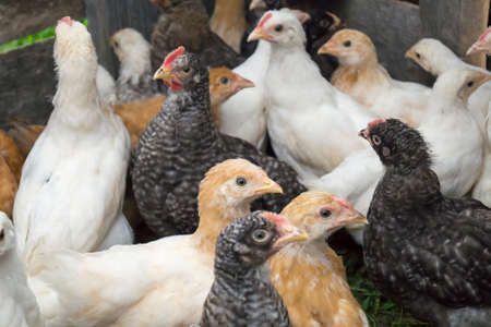 chickens at a chicken farm outdoors. Chicken farm concept.Chicken in the backyard near the chicken coop