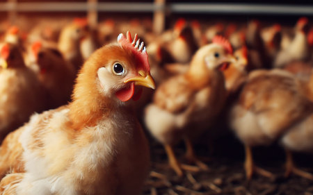 Chicken farms, large-scale livestock production, chickens in coops, meat industry