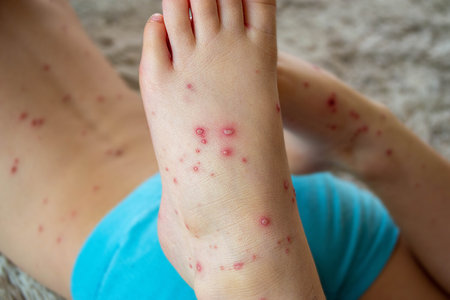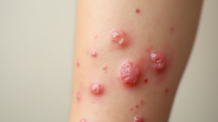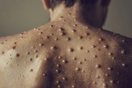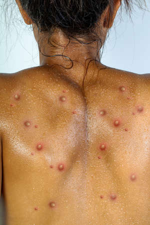 Close up of a back with large clusters of raised, inflamed bumps across the skin, indicating irritation