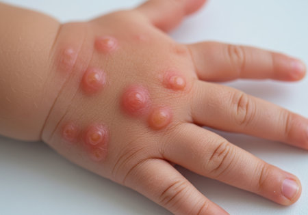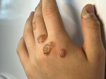 Close-up of Molluscum Contagiosum also called water wart. Treated viral formations on the skin of a child's hand. Health care.