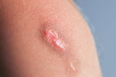 remove warts on hands process Hand with many scars after wart removal by chemical freezing. Damage to skin. Dermatology operation and treatment. White background. Process of removing skin defect.