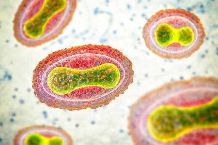 Variola virus, a virus from Orthopoxviridae family that causes smallpox, and other viruses from pox family, monkeypox, molluscum contagiosum virus, 3D illustration