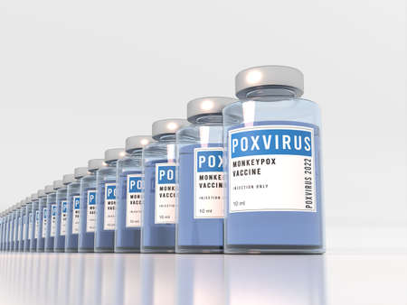 Monkeypox pox poxvirus vaccine glass bottles. Plenty of bottles on white background with reflection. 3D illustration. low point of view. Teal orange light.