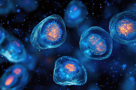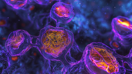 3d illustration of transparent glowing human cells with visible organelles, nucleus and DNA