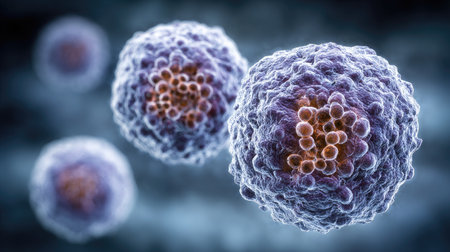 Close-up view of glowing bacteria and viruses with spiky exteriors, floating in a dark blue, luminous, and abstract background.