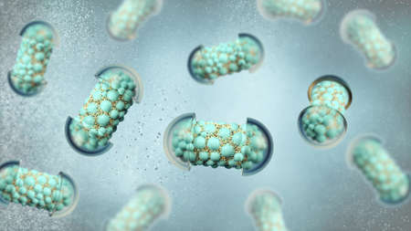 Colorful abstract chaotic structure balls inside the capsule, pharmacy and medical concept 3d
