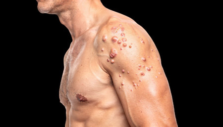 Side profile of a male torso with visible papules on the shoulder and upper back isolated on white to showcase typical skin lesion distribution.