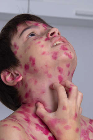 Mom lubricates the rash from chickenpox on sons body and abdomen with with red antiseptic using cotton buds.11-year-old boy suffers from chickenpox. Varicella blisters applying with antiseptic drug,
