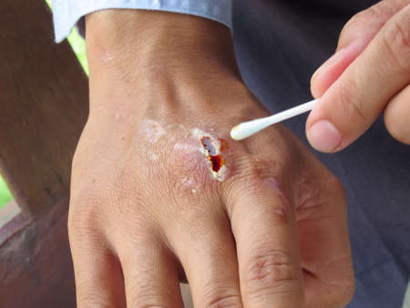 Treating the skin rash with a cotton swab. chickenpox virus. Skin rash and blisters on the body. Treatment concept for symptoms of Varicella zoster virus, fucorcinum treatment, antiseptic and antifungal.