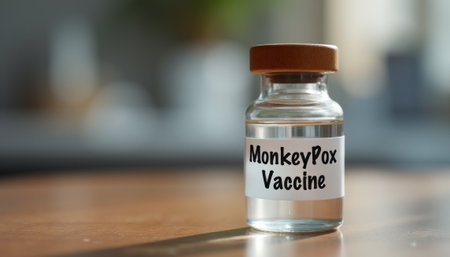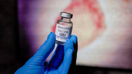 pharmacist's hand with latex glove holding monkeypox vaccine, with smallpox virus photo in the background