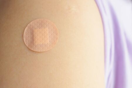 Close up circle brown adhesive bandage on patient arm after medicine injection or vaccination