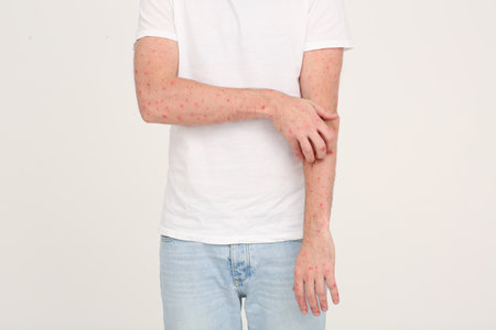 Patient showing arm and hand with red itchy painful rash. Allergic symptom on male hands. Dermatology, skin care. White background, top view
