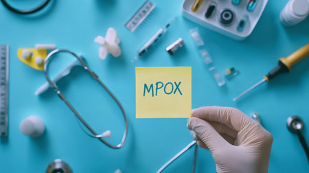 Gloved hand holding a sticky note with MPOX written with scattered medical tools in the background. Monkeypox outbreak concept