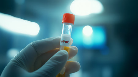 Gloved hand holding MPox test tube in a lab representing viral testing and healthcare efforts for monkeypox.