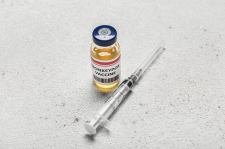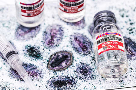 monkeypox virus vaccine vials, with microscopic photo of the virus in the background, pandemic research and study