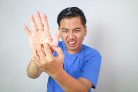Male hands affected by blistering rash because of monkeypox or other viral infection. Monkeypox new disease dangerous over the world.