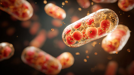 A stunning macro view of bacterial cells featuring vibrant red blood cells and granules, all suspended in a transparent capsule against a dark and dramatic background, highlighting microscopic life.