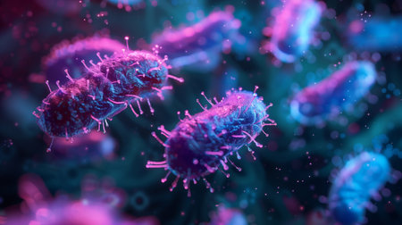 Close-up view of bacteria in a vibrant microscopic world, showcasing intricate details and colorful structures.