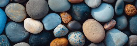 A collection of smooth pebbles in various shades of blue, white, and brown are closely arranged on a dark surface, showing their unique textures and natural beauty.