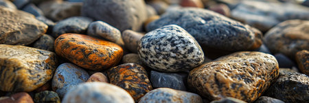 This enchanting close-up image captures smooth pebbles on a shoreline, bathed in the soft light of sunrise. The stones create a natural texture, evoking peace.