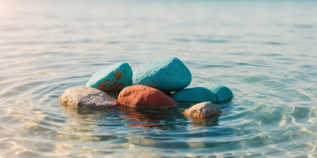 AI Generated. Blue cobblestones under the calm water surface with sun reflections