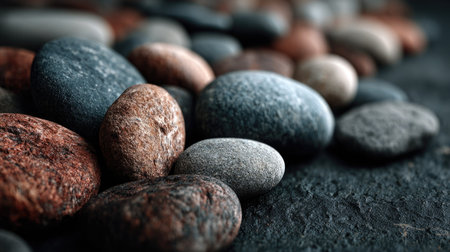 A close-up image of smooth stones in various colors and shapes resting on a dark surface, perfect for backgrounds, textures, and natural design elements.