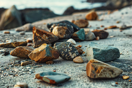 A serene close-up of various colorful pebbles resting on the beach, glistening under warm sunlight, with gentle ocean waves in the background.