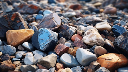colorful rocks, arranged on the beach, showcase a stunning combination of dark indigo and light amber hues. with highly polished surfaces, these nature-inspired pieces feature a captivating blend of dark gray and light blue tones. the use of a sabattier filter adds a unique touch, enhancing the rounded shapes and vibrant colors of the rocks. ai generated