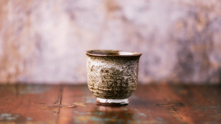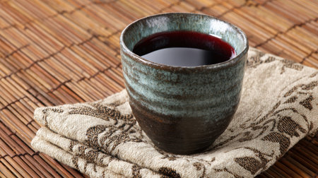 A rustic ceramic cup holds red wine, resting on a tatami-inspired surface, evoking warmth and tranquility for a relaxing moment.