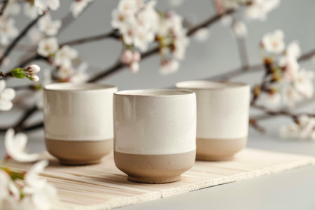 Three ceramic cups showcasing a white glaze and beige base are artfully arranged on a wooden surface with cherry blossoms in the background.