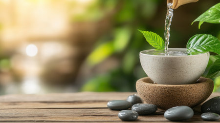 Escape to a serene spa oasis where hydration meets wellness Indulge in freshly infused water, surrounded by smooth stones and lush greenery The calming ambiance will replenish your body and rejuvenate your mind, leaving you feeling refreshed and revitalized AI Generative
