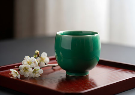 A close-up shot of a vibrant green, handleless tea cup resting on a dark wooden tray, adorned with delicate white plum blossoms, evoking a sense of tranquility and natural beauty.