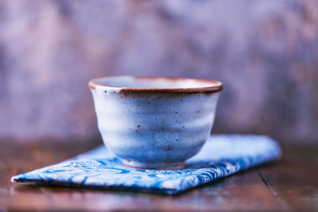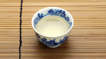Japanese sake in ceramic ochoko cup on tatami table