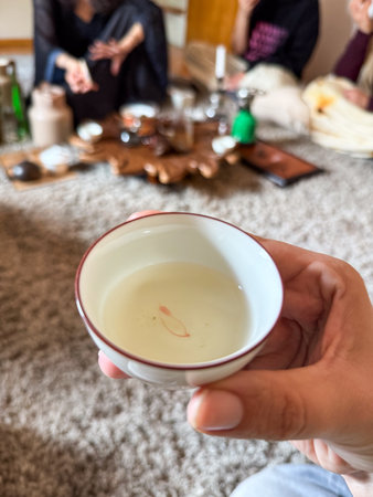 Moment of connection through tea during traditional ceremony. Mindfulness, ritual and shared presence as part of the tea culture experience