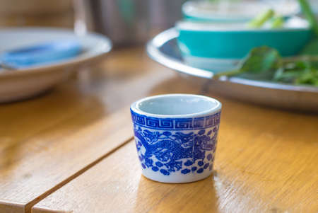 Traditional porcelain bowl on a rustic background. Selective focus.