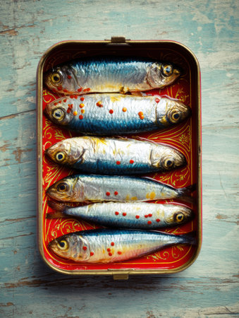 A retro-style box of sardines displays neatly arranged shiny fish, suggesting freshness and quality, perfect for gourmet dishes or snacking.
