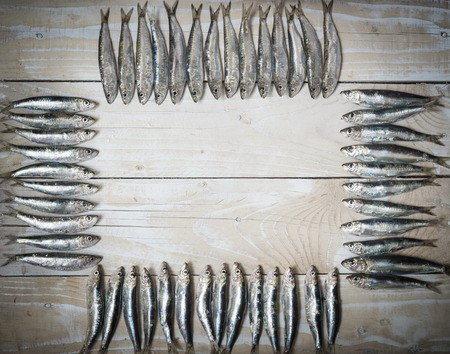 Fresh sardines on rustic wooden background.