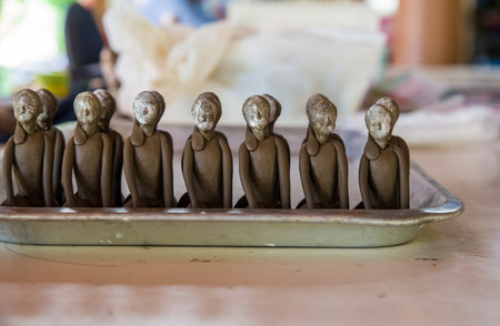 Row of blank unfinished ceramic figures on a studio shelf in a DIY store for painting.