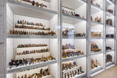 Showcase with collection of figurines in museum of ethnology in Barcelona, Spain