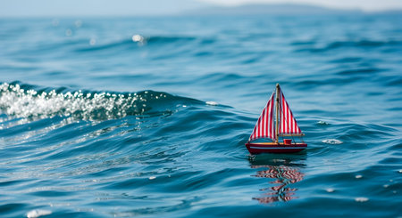 A miniature sailboat floats gently on a rippled water surface, showcasing intricate reflections and droplets, capturing a serene moment in blues.
